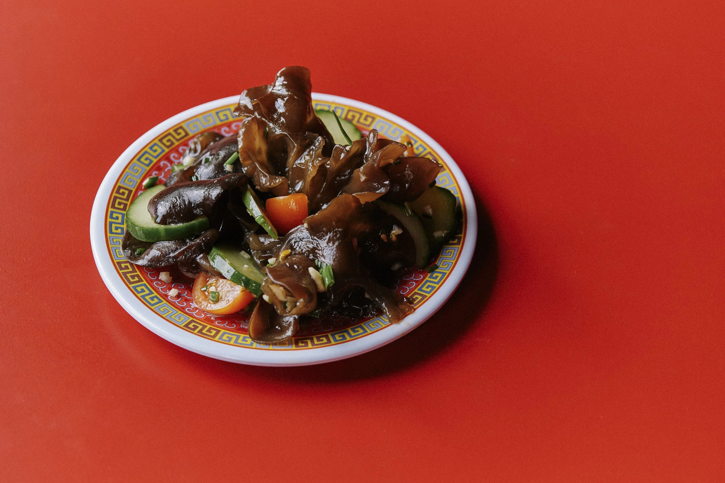 Changbai Mountain black wood ear mushroom, rice vinegar, soy sauce, sesame oil, cucumber, red bell pepper. Excellent for heart health, constipation relief, and kidney health. (v)